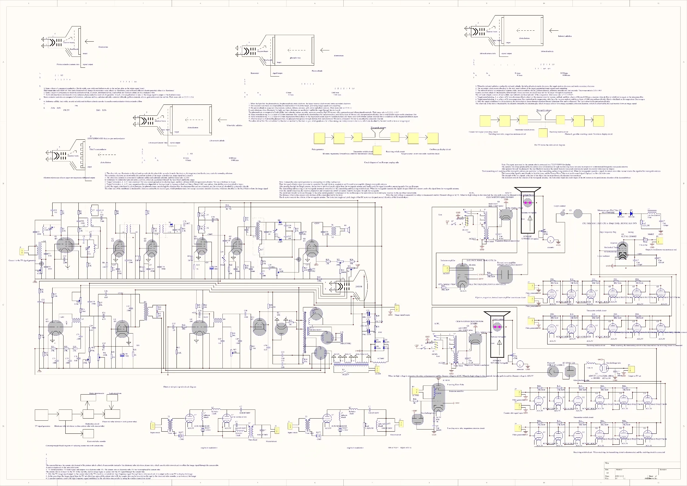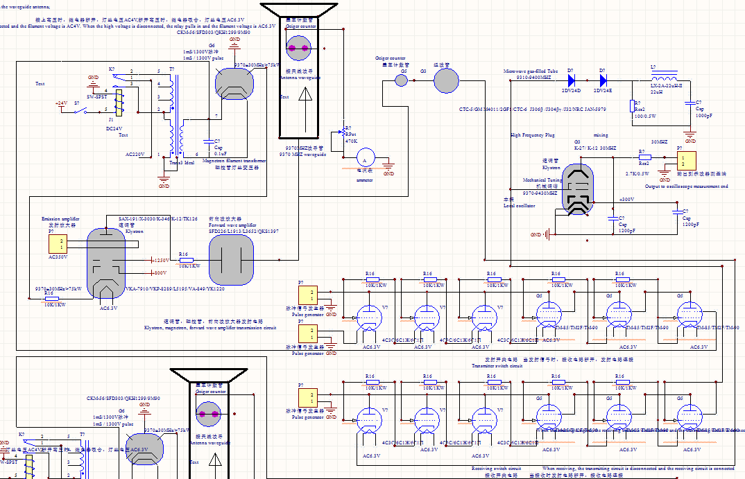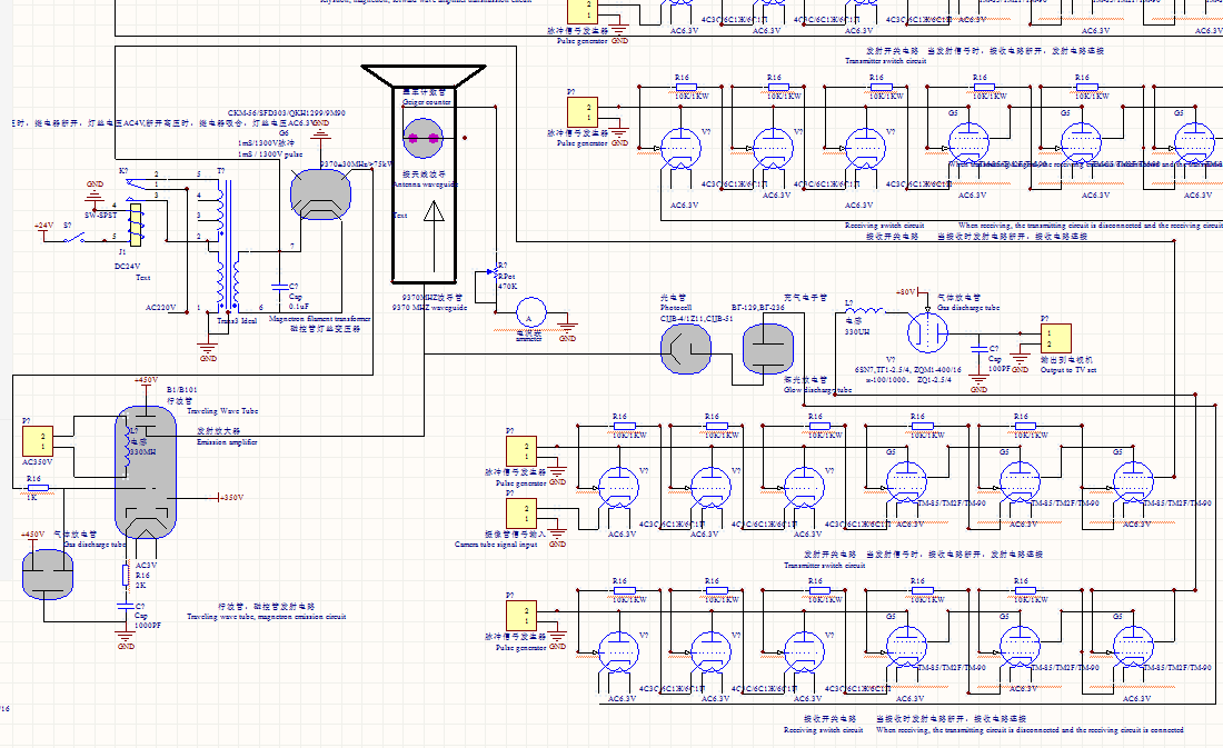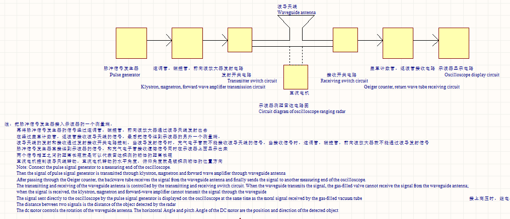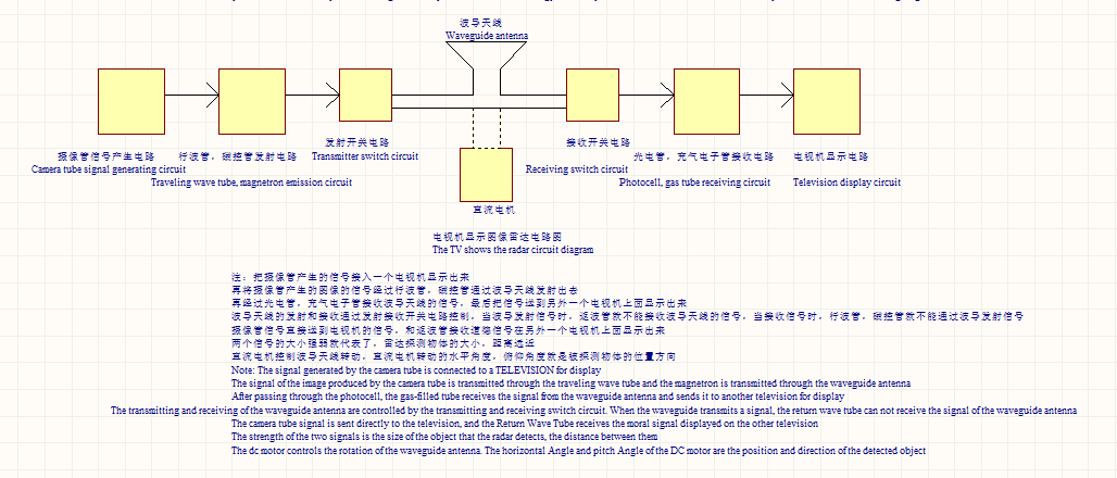 中国面包师贴吧-楼主(阅:1630/回:0)用示波器和电视机接收信号的雷达用示波器和电视机接收信号的雷达 用示波器和电视机接收信号的雷达 用示波器和电视机接收信号的雷达是一种使用示波器接收脉冲信号发生器发射的信号,电视机接收被行波管,磁控管发射的摄像管信号的雷达。首先使用示波器的一个测量端测量脉冲信号发生器发出的方波信号。再把这个信号通过磁控管,速调管,前向波放大器发射电路传输到波导天线,并发射出去,去探测物体。波导天线利用盖革计数器,返波管接收电路接收被探测物体反射的信号,再把这个信号送到上面那个示波器的另外一个测量端测量信号的强度。这两个信号在示波器上面相距的距离长短,代表了被探测物体距雷达发射位置的距离远近,两个信号的距离越长,被探测物体距离雷达发射端越远。两个信号的距离越短,被探测物体距离雷达发射端越近,它们两者成正比。接收信号电压越低,证明信号被反射的越弱。接收信号电压越高,证明信号被反射的越强。波导天线的发射和接收不能同时进行,当波导天线发射信号时,发射电路和波导天线连接,接收电路就和波导天线断开。当波导天线接收信号时,发射电路和波导天线断开,接收电路就和波导天线连接。波导天线的发射和接收受开关电路控制。磁控管,速调管,前向波放大器发射电路可以将信号放大到1000V左右并发射出去。盖革计数器,返波管接收电路具有放大作用,可以接受几毫伏的信号。同时还可以使用行波管,磁控管将摄像管采集的图像信号通过波导天线发射出去,去探测物体。再利用光电管,充气离子管,水银整流管,采集波导天线上接收的被探测物体反射信号。再把这个信号送到电视机显示出来。电视机显示的信号强度越大证明信号距雷达发射天线越近,反之越远。把上面摄像管的信号直接送到电视机显示,和上面的信号在电视机的显示可以做对比。波导天线的发射和接收不能同时进行,当波导天线发射信号时,发射电路和波导天线连接,接收电路就和波导天线断开。当波导天线接收信号时,发射电路和波导天线断开,接收电路就和波导天线连接。波导天线的发射和接收受开关电路控制。磁控管,行波管发射电路可以将信号放大到1000V左右并发射出去。光电管,充气离子管,水银整流管接收电路具有放大作用,可以接受几毫伏的信号。还可以用一个直流电机控制波导天线的水平旋转,可以用电机同步发送机,旋转变压器,自整角机记录电机的旋转角度,当天线探测到物体时,电机的旋转角度就是探测物体的水平方位角。还可以用一个直流电机控制波导天线的垂直旋转,可以用电机同步发送机,旋转变压器,自整角机记录电机的旋转角度,当天线探测到物体时,电机的旋转角度就是探测物体的俯仰方位角。上面的示波器,脉冲信号发生器,摄像管,电视机的电路图的下载网址是:链接:https://share.weiyun.com/UyxAEbCehttps://share.weiyun.com/obLdShyJ 链接:https://pan.baidu.com/s/1tb4y6ZdPwA4pt6bXboR49Q ;提取码:u25k 电路图如下所示: