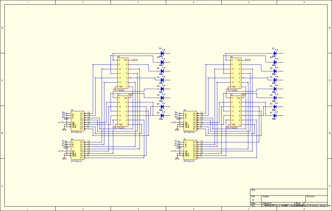 74LS138译码器(62)将上述结果编码D1D2D3D4变成8位十进制编码输出,74LS138译码器(63)将上述失眠时间代码,即IO口P3.4,P3.3,P3.2上的代码变成8位十进制编码输出。74LS08与门(64),74LS08与门(65)将上述两个8位10进制代码进行差1位的与运算,得到8位10进制数,输出并点亮二极管。