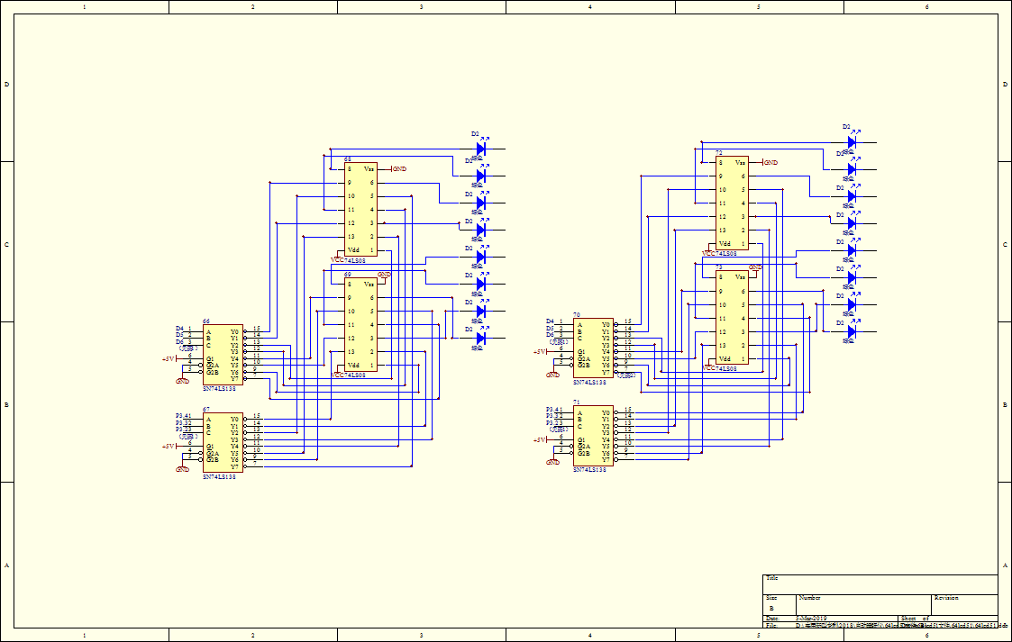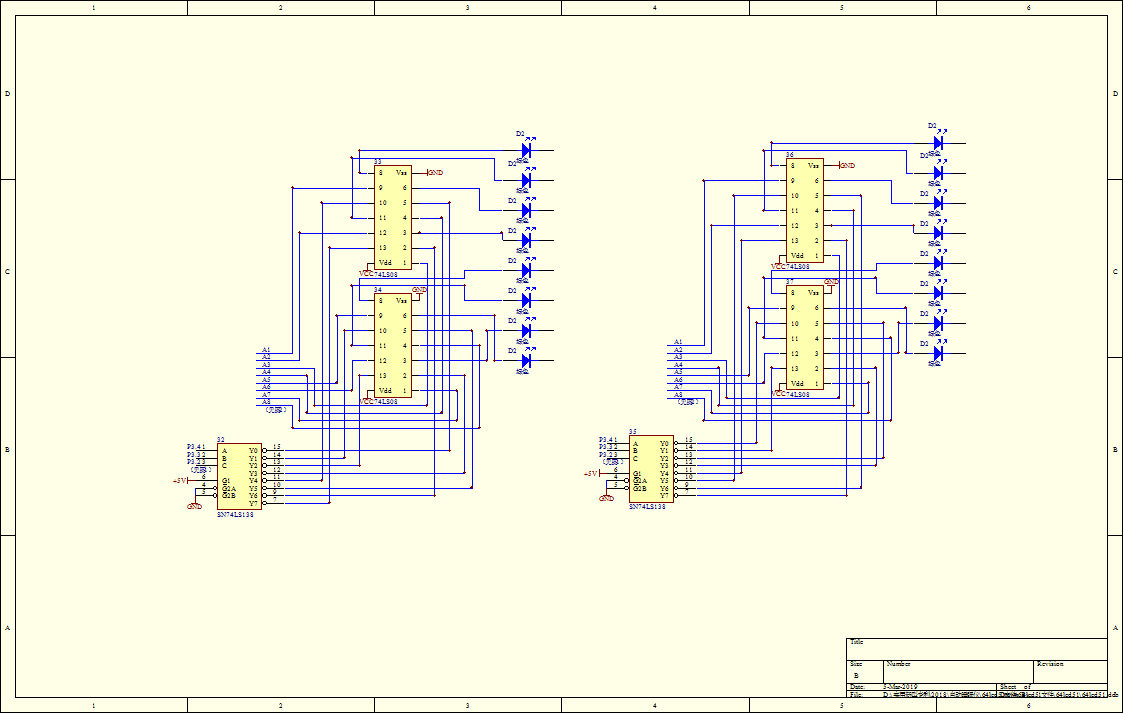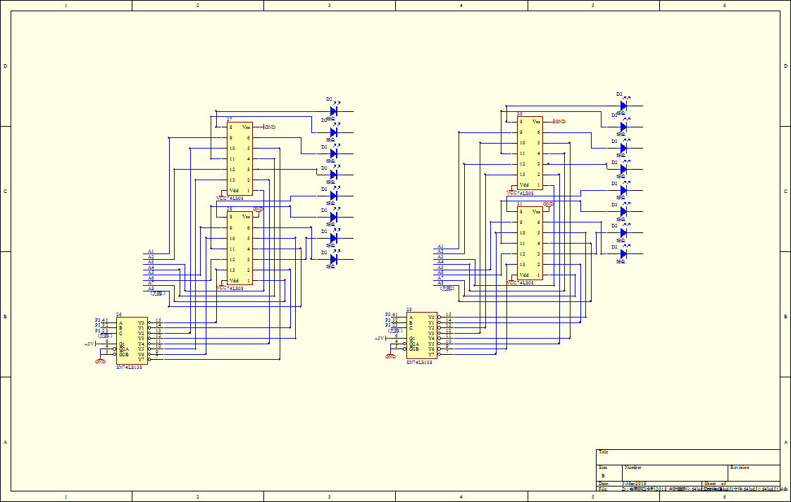 74LS138译码器(26)将上述结果编码D1D2D3变成8位十进制编码输出,74LS138译码器(27)将上述失眠时间代码,即IO口P3.4,P3.3,P3.2上的代码变成8位十进制编码输出。74LS08与门(28),74LS08与门(29)将上述两个8位10进制代码进行不差位的与运算,得到8位10进制数,输出并点亮二极管。
