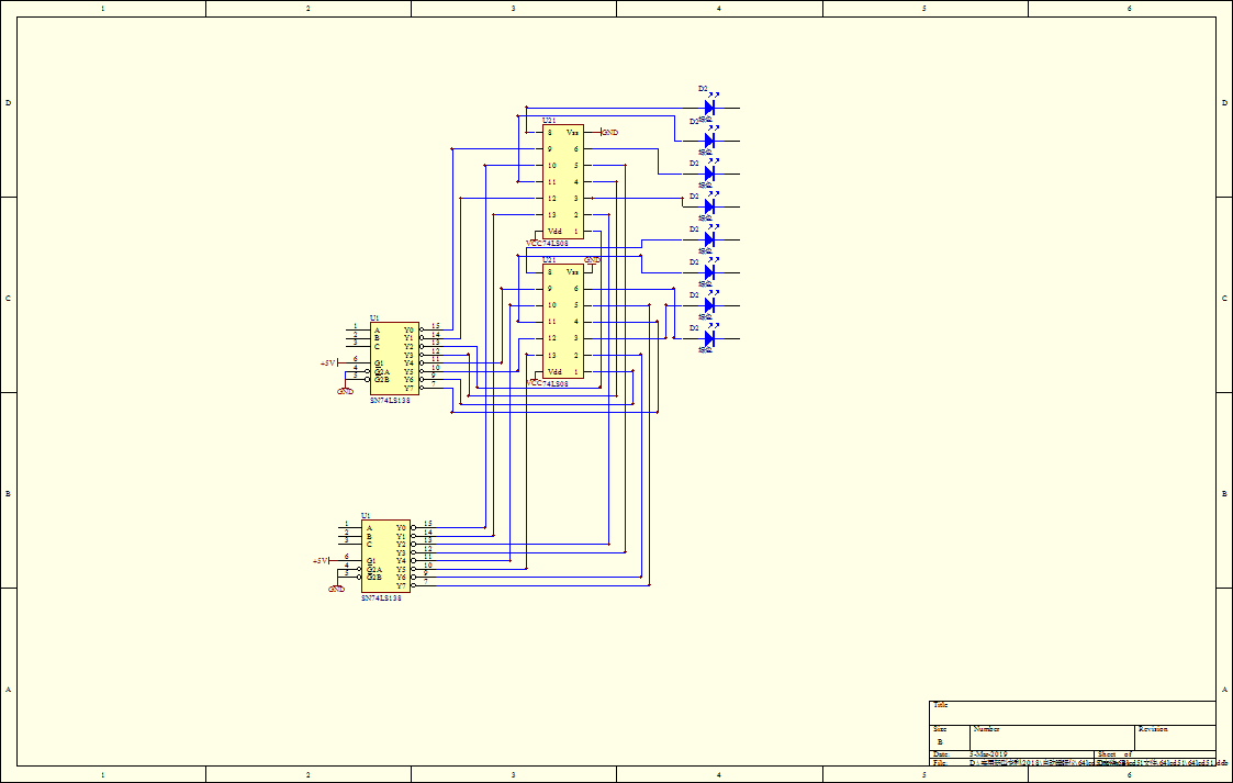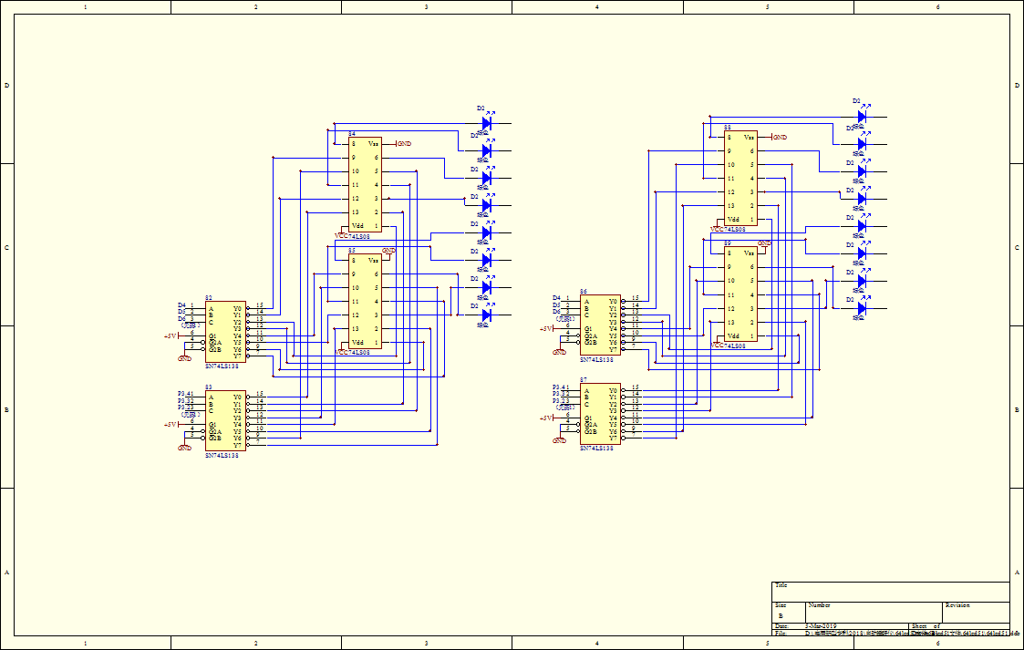 74LS138译码器(11)将二进制患者喝酒感觉情况代码转换为8个10进制高电平,74LS138译码器(12)将二进制失眠病情代码转换为8个10进制高电平。74LS32或门(13)和74LS32或门(14)将上述两个8位10进制代码进行或运算并输出,74LS32或门(13)和74LS32或门(15)将高位10进制代码进行或运算并输出。74LS08与门(16)和74LS08与门(17)将上述两个8位10进制代码进行与运算并输出,74LS86异或门(18)和74LS86异或门(19)将上述两个8位10进制代码进行异或运算并输出。最终得到16位10进制代码B1B2B3B4B5B6B7B8B9B10B11B12B13B14B15B16。