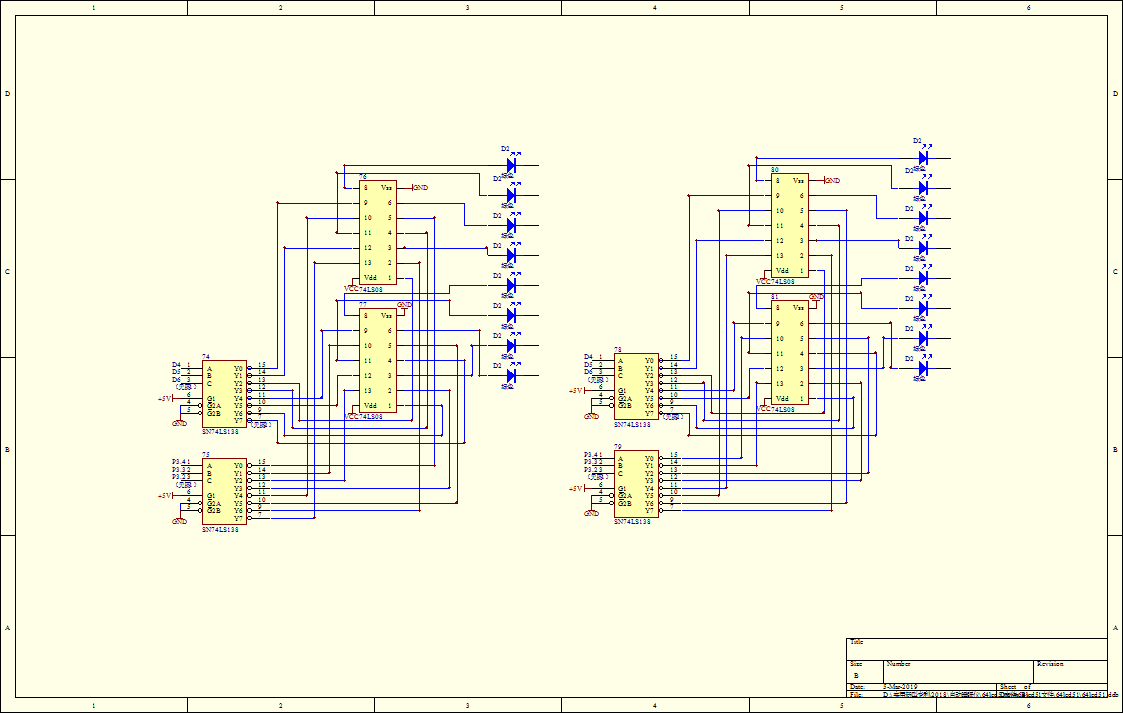 74LS138译码器(78)将上述结果编码D1D2D3D4变成8位十进制编码输出,74LS138译码器(79)将上述失眠时间代码,即IO口P3.4,P3.3,P3.2上的代码变成8位十进制编码输出。74LS08与门(80),74LS08与门(81)将上述两个8位10进制代码进行差5位的与运算,得到8位10进制数,输出并点亮二极管。