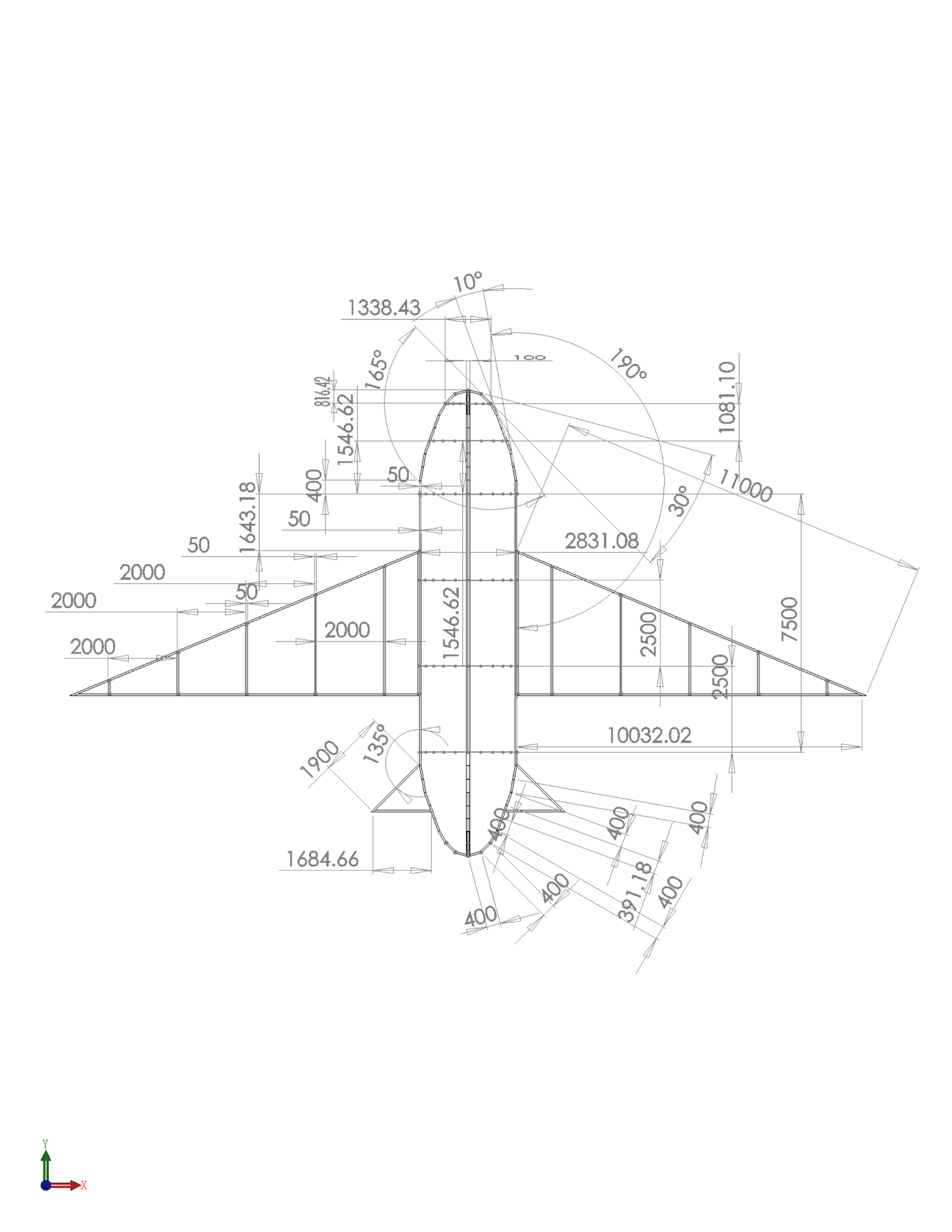 中国面包师贴吧-楼主(阅:1387/回:0)由铝合金槽钢和蒙皮构成的135度机翼的喷气式飞机由铝合金槽钢和蒙皮构成的135度机翼的喷气式飞机 由铝合金槽钢和蒙皮构成的135度机翼的喷气式飞机 下面介绍由铝合金槽钢和蒙皮构成的135度机翼的喷气式飞机,如下图所示,它的机头横截面由数根短铝合金槽钢构成,它的机头的纵剖面由数根短铝合金槽钢构成,距机头816.42mm处有一个内切圆直径是1338.43mm的铝合金槽钢18边型构成的龙骨,距上面龙骨1081.1mm处有一个内切圆直径是2279.63mm的铝合金槽钢18边型构成的龙骨,每个铝合金之间的外夹角是190度。它的机尾和机头是一摸一样的圆锥体。它的机身横截面由2段长度是7500mm的铝合金槽钢构成,它的机身纵剖面由2段长度是7500mm的铝合金槽钢,机身中有4个相距2500mm的内切圆直径是2831.08mm的铝合金槽钢36边型构成的龙骨,它的左机翼横截面是顶角是67.5度斜边是11000mm的直角三角形,它的内部有5个相距2000mm的铝合金槽钢垂直于长直角边,它距机头尾部的距离是1643.18mm,它的右机翼横截面是顶角是67.5度斜边是11000mm的直角三角形,它的内部有5个相距2000mm的铝合金槽钢垂直于长直角边,它距机头尾头的距离是1643.18mm,这两个三角形都由铝合金槽钢构成,它们组成一个顶角是135度的等腰三角形。上面这些铝合金槽钢都是横截面长为100mm,宽50mm,厚10mm的6061铝合金槽钢。同时这个飞机的右尾翼是横截面是45度角的等腰直角三角形,这个飞机的左尾翼是横截面是45度角的等腰直角三角形,它们安装在机身铝合金槽钢的尾部。2台涡扇发动机安装右机翼的下边,2台涡扇发动机安装左机翼的下边,在这些铝合金槽钢组成一个飞机的框架。在这些机头框架外面可以用锥度弯板机,切板机把宽400mm厚2mm的铝合金铝板卷成一个机头,然后用拉铆枪或压铆机或铝合金焊接把这个圆锥固定到机头龙骨上。在这些机身框架外面可以用弯板机,卷板机把宽2500mm厚2mm的铝合金铝板卷成一个直径为2831.08mm的圆柱,然后用拉铆枪或压铆机或铝合金焊接把这个圆柱固定到机身龙骨上。在这些机头框架外面可以用折板机,折弯机,剪板机,打拱机把宽400mm厚2mm的铝合金铝板折成一个三角形龙骨外壳,然后用拉铆枪或压铆机或铝合金焊接把这个三角形龙骨外壳固定到机头龙骨上。上面的3D模型可以在链接:https://pan.baidu.com/s/1DrVz15WcEluHkm4dLPCIHw 下载,提取码:lr4b。https://share.weiyun.com/57GcEWQ