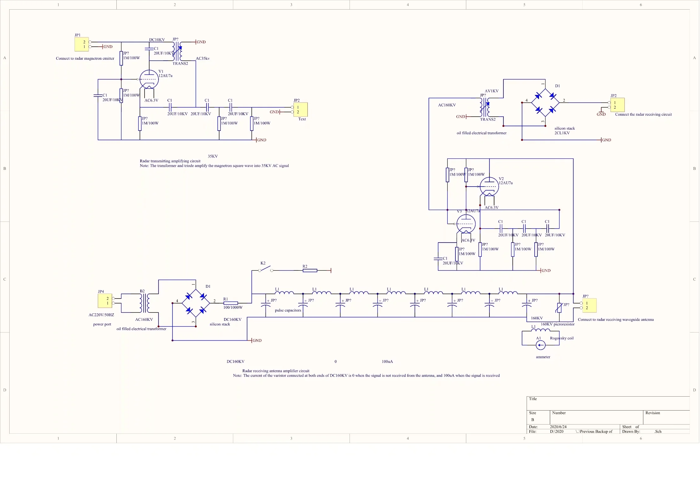 中国面包师贴吧-楼主(阅:1870/回:0)使用高压变压器发送信号和压敏电阻接收信号的雷达使用高压变压器发送信号和压敏电阻接收信号的雷达 使用高压变压器发送信号和压敏电阻接收信号的雷达 普通雷达通过磁控管将高频脉冲信号发射出去,然后通过铁氧体转换开关,从雷达波导天线接收信号,下面介绍一种,将磁控管发出的高频脉冲信号变换为正弦波信号,再经过变压器变换为35KV高压并通过雷达波导天线发射出去的雷达。这种雷达通过两端接DC160KV的高压的压敏电阻接收信号,这时,这个压敏电阻两端是绝缘的,只要电压稍微升高一点,压敏电阻两端就会有50uA的电流通过,最大有1mA电流通过。也就是当雷达的波导天线接收到雷达信号时,压敏电阻的两端的电压就会升高,压敏电阻内部就会有电流通过,这个电流在经过放大电路放大进入雷达的接收电路,雷达就会接收信号。雷达电路图下载地址是:https://share.weiyun.com/T7sqZb09 链接:https://pan.baidu.com/s/1SabDpZLZPwoGPEfXuDRKqA ;提取码:i1kt下面是雷达接收发射的电路图  下面是雷达的电路图